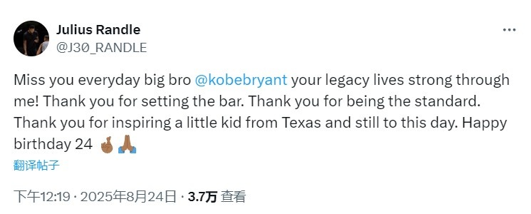 兰德尔在个人推特上写道:“每天都在想念你,我的大哥。你留给世界的东西仍然强烈的激励着我。谢谢你设定了标准。谢谢你成为标杆。谢谢你激励了一个来自德克萨斯的孩子,你至今还激励着他。24号,生日快乐。”