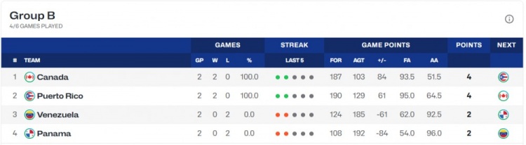 8月24日讯 男篮美洲杯现在正在进行小组赛阶段的争夺,B组,加拿大男篮和波多黎各男篮小组赛前两场都取得大胜,目前都是2胜0负。