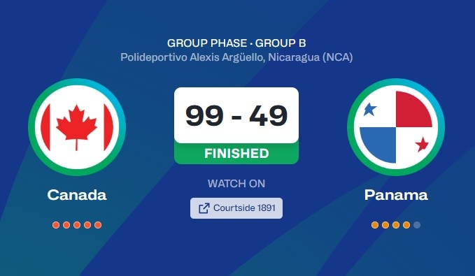 8月24日讯 今天结束的一场男篮美洲杯小组赛,加拿大男篮99比49大胜巴拿马男篮50分。