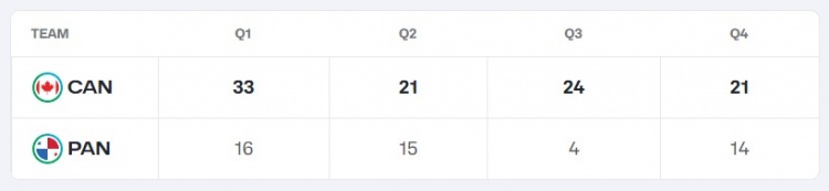 本场比赛,加拿大男篮首节就领先17分,第三节还打出单节24比4。