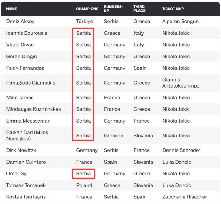 FIBA官方预测欧锦赛,15人中10人预测塞尔维亚夺冠,1人选择了土耳其,并且预测申京拿到MVP。