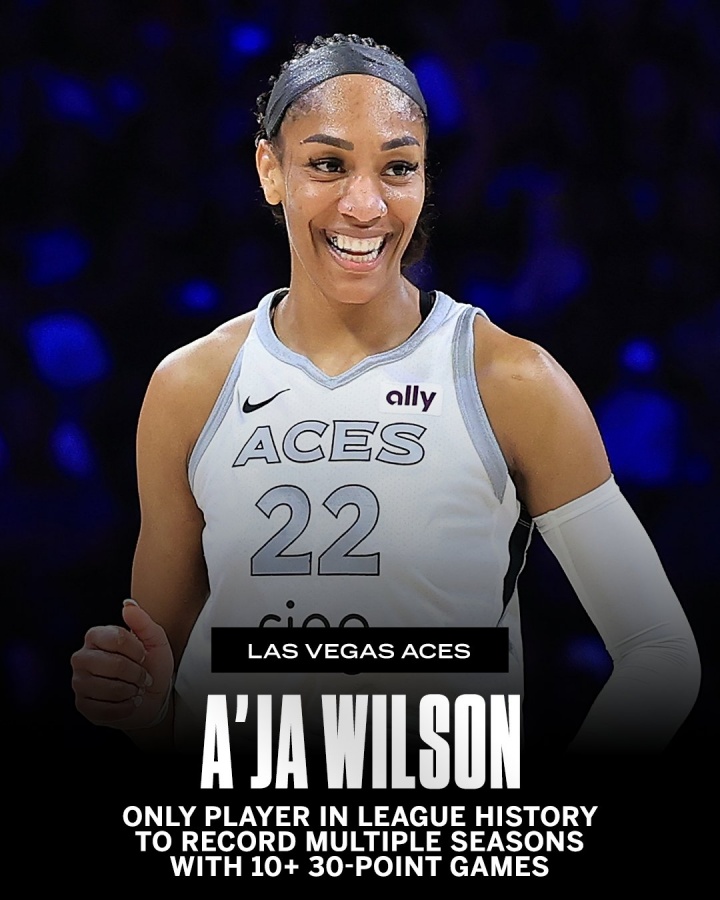 这是阿贾本赛季第10次30+,她也成为WNBA历史第一个多个单赛季至少10场30+的球员。
