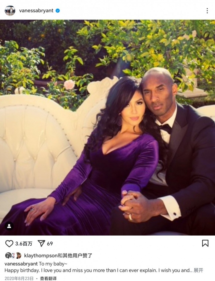 科比去世至今,瓦妮莎每年8月23日都在社媒上为科比送生日祝福。