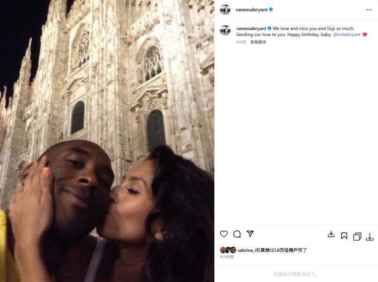 瓦妮莎社媒祝科比生日快乐:我们非常爱&想念你和Gigi