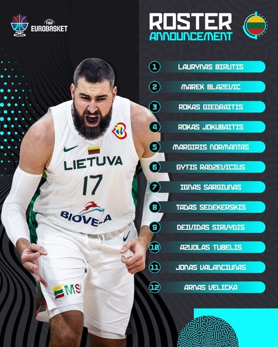 8月24日讯 立陶宛男篮欧锦赛12人名单出炉,瓦兰领衔。