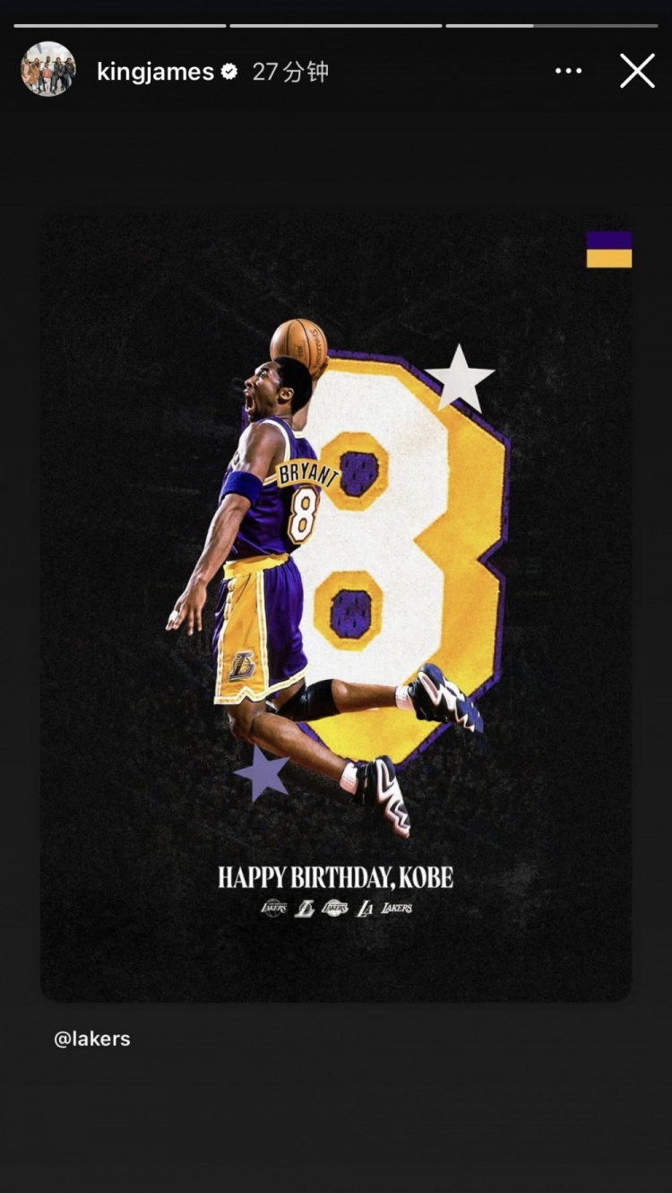 怀念传奇!詹姆斯IG转发并点赞湖人官方祝福科比生日快乐贴