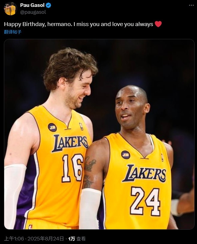 兄弟情深!加索尔更推为科比送生日祝福:我想你 永远爱你