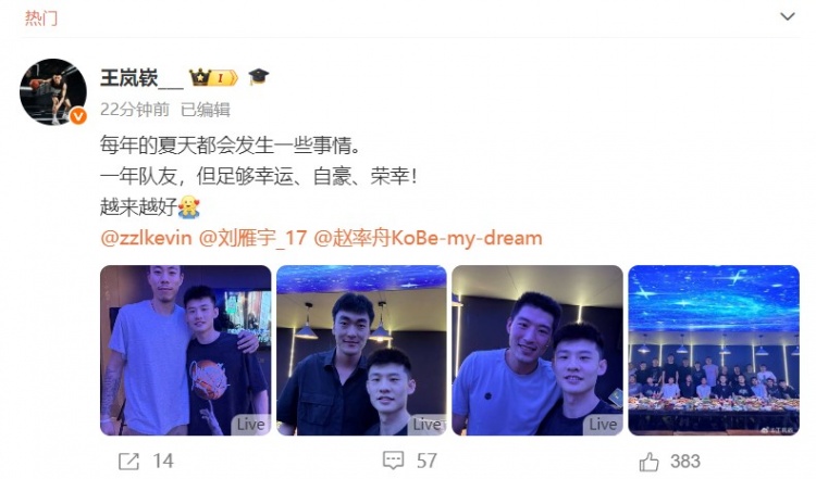 8月31日讯 辽篮后卫王岚嵚今天更新社媒,送别张镇麟、刘雁宇、赵率舟三位队友。