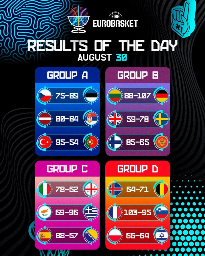 08月31日讯 男篮欧锦赛当地时间8月30日的12场小组赛全部结束,详细赛果如下: