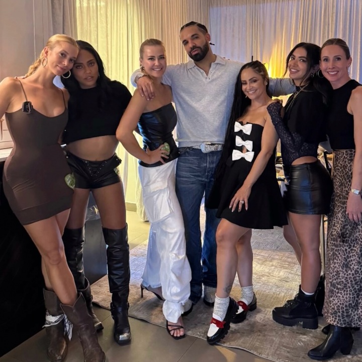 📸Drake米兰演唱会后与阿耶莎等6名女性在后台合照留念