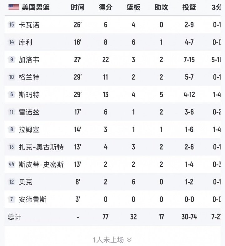 此番小组赛对手美国与巴西再次交战,美国延续了上场获胜的状态,开局表现依然出色。美国队半场领先14分,最多领先近20分。