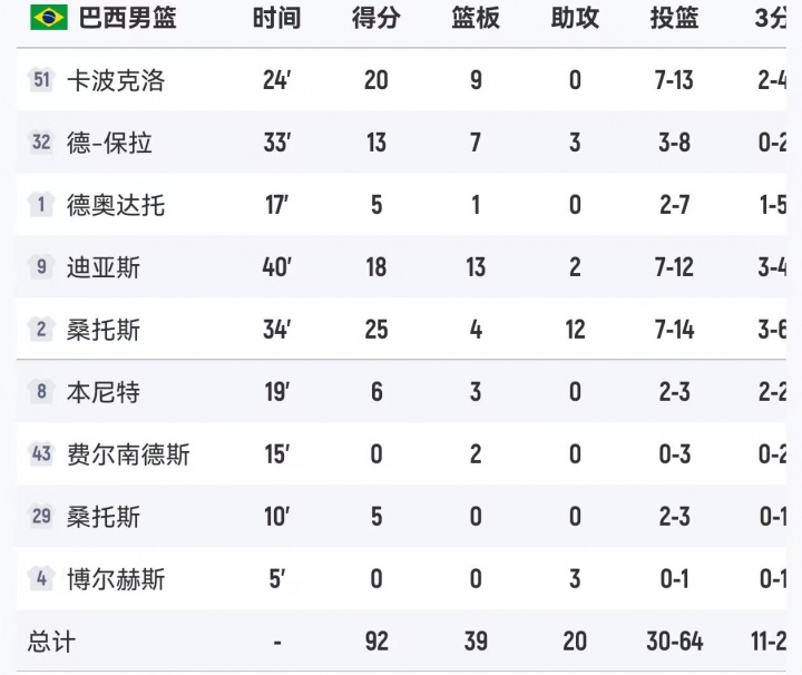 最终,巴西队在三节结束落后10分的情况下,以末节净胜25分的出色表现完成超级大逆转。