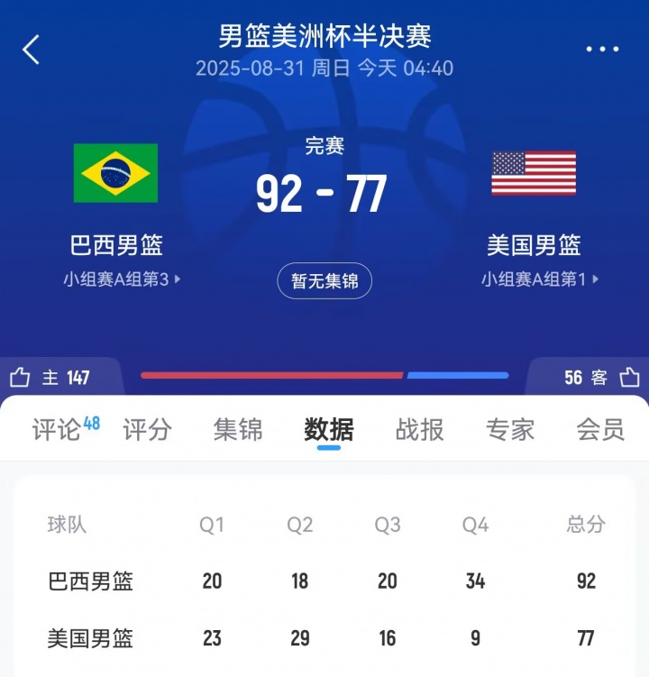 08月31日讯 男篮美洲杯半决赛,巴西92-77逆转淘汰美国,率先晋级决赛。