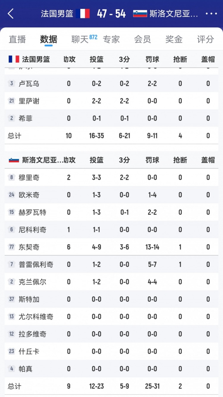 上半场,法国男篮11罚9中,而斯洛文尼亚获得惊人的31次罚球,命中25个,其中东契奇个人14罚13中。