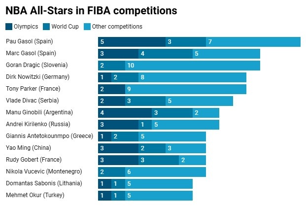 美媒统计NBA球星为国出战大赛次数:大加15次居首 姚明8次并列第9