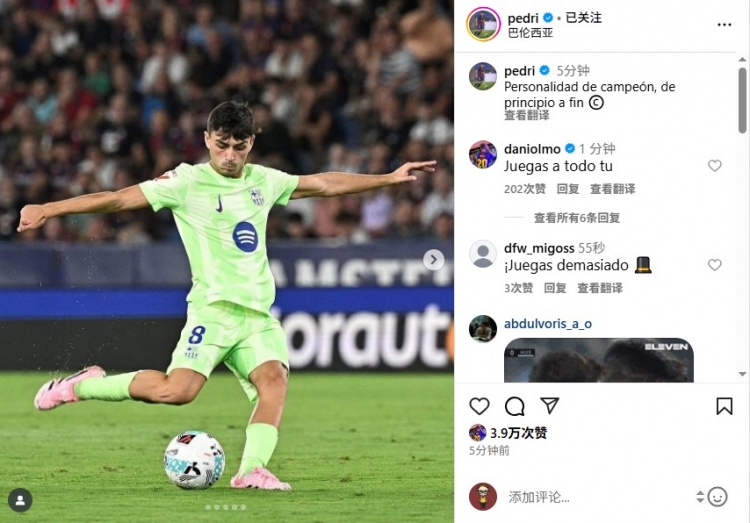 佩德里ins晒赛场照:从开始到结束,冠军的心态