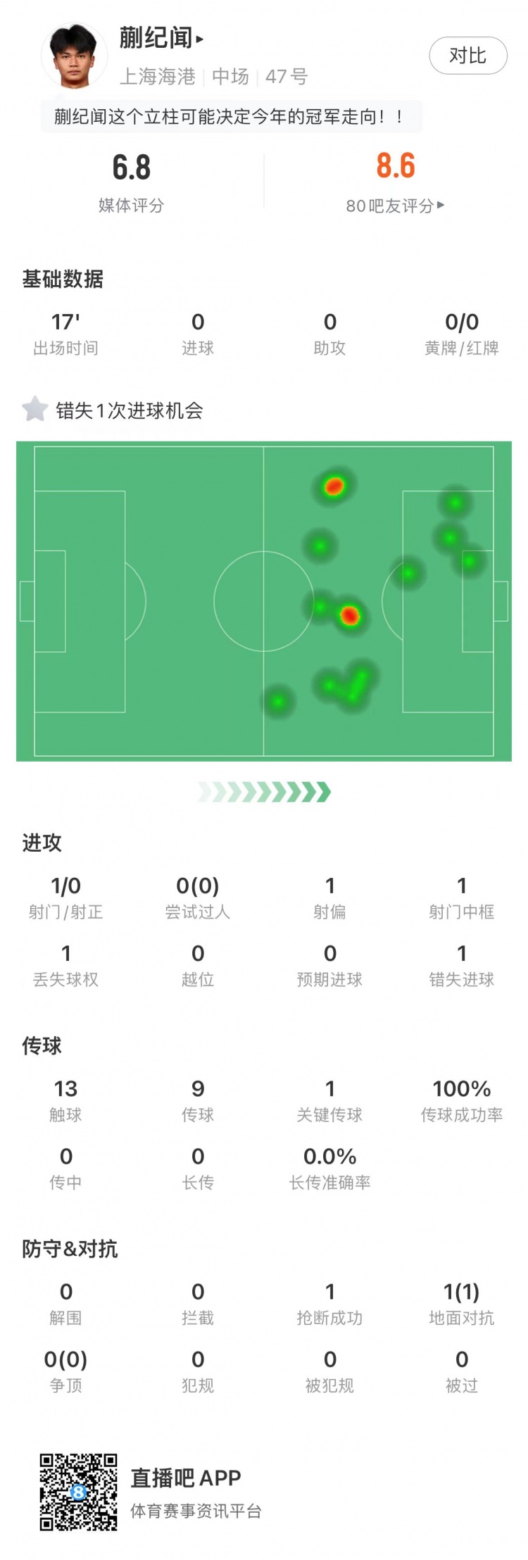 本场蒯纪闻在下半时替补外援梅伦多登场,出场后他显得非常活跃。在这17分钟里,蒯纪闻的传球成功率达到了100%,比赛最后时刻,他用灵活的跑位创造了一次良机,但他的射门击中了球门立柱,错失了绝杀。