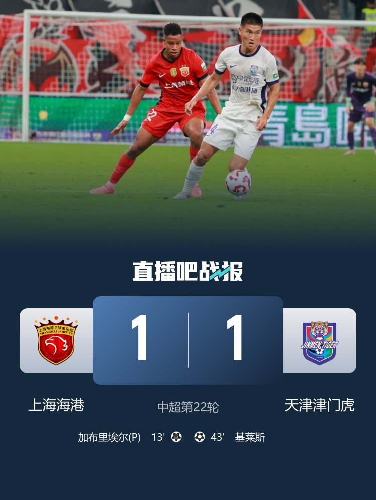 08月24日讯 中超第22轮,天津津门虎客场1-1战平上海海港,终结了对海港的5连败。