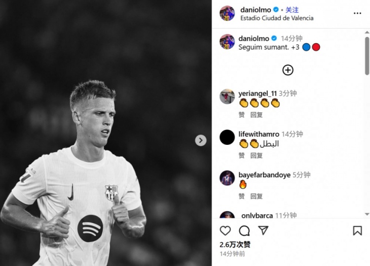 8月24日讯 奥尔莫更新社媒,庆祝巴萨本轮逆转取胜。