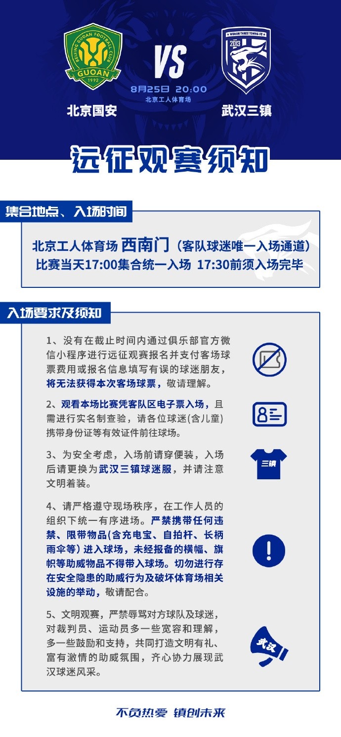 中超联赛第22轮,武汉三镇客场对阵北京国安远征观赛须知