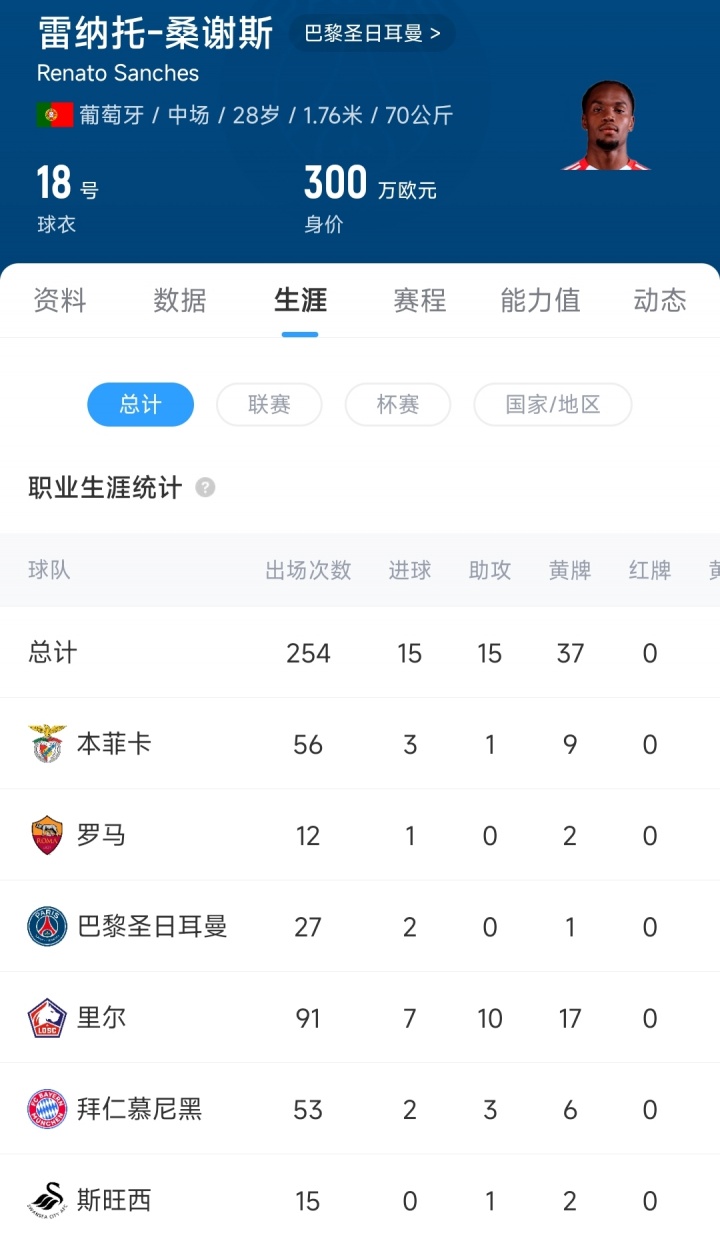 目前桑谢斯的德转身价仅有300万欧元,而在2016年桑谢斯随葡萄牙欧洲杯夺冠,荣膺当年金童奖时,18岁的桑谢斯的身价曾达到3000万欧,并以3500万欧元加盟拜仁。