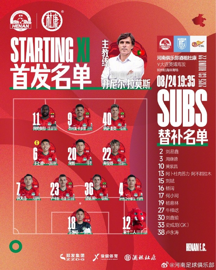 中超联赛第22轮 河南VS大连英博首发及替补队员名单