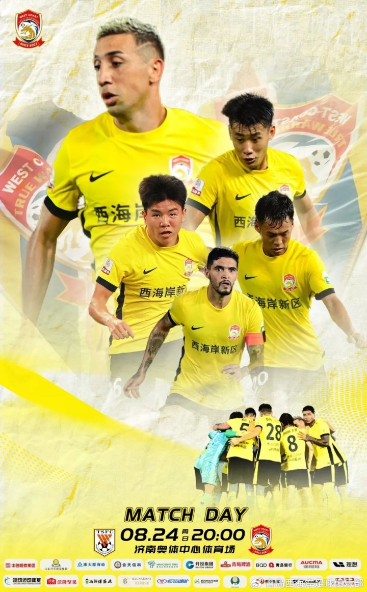 青岛西海岸首发:1-李昊、5-里切利(F)、22-杨希、28-张呈栋、36-孙捷、8-张修维、17-陈柏良、20-何龙海、21-木塔力甫、9-阿齐兹(F)、11-戴维森(F)