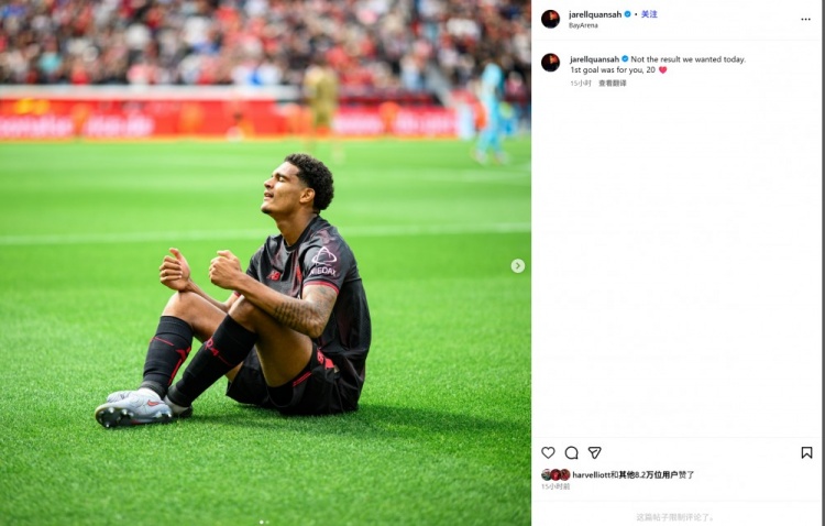 本场比赛勒沃库森新援宽萨打进个人德甲首球,进球后也做出打游戏庆祝动作致敬若塔,他在社媒晒照配文写道:“今天没有得到我们想要的结果。我的首粒进球献给你,20号❤️”