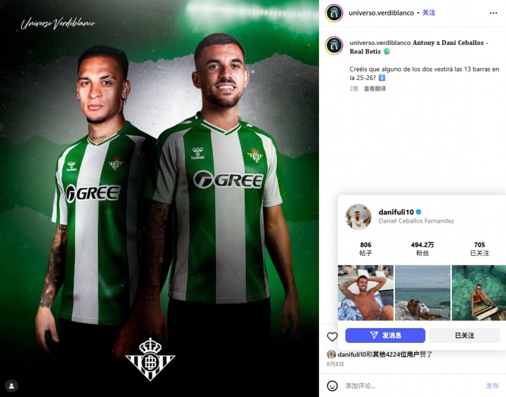 贝蒂斯球迷社媒账号universo.verdiblanco晒出海报,内容为塞巴略斯、安东尼身穿贝蒂斯球衣,配文:“安东尼X塞巴略斯——贝蒂斯。你们认为他们两人会在25-26赛季身披贝蒂斯的球衣吗?”