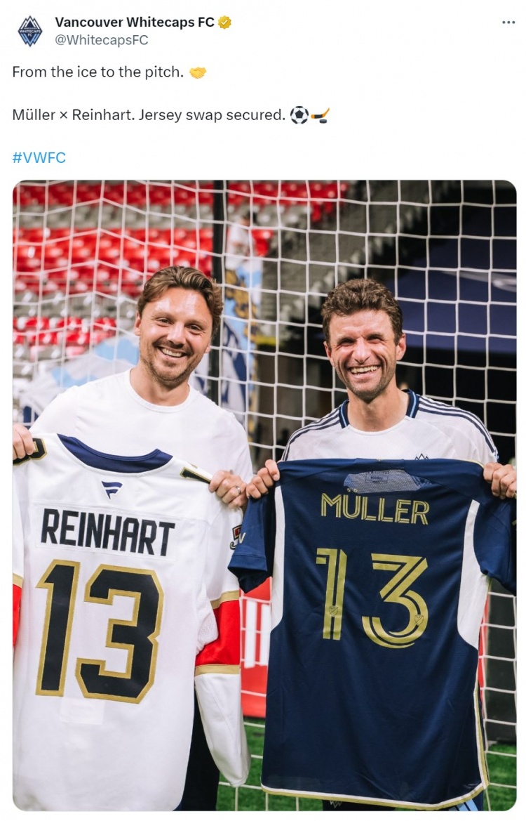 穆勒与效力于NHL佛罗里达美洲豹的加拿大冰球运动员莱因哈特见面,并互换球衣,温哥华白浪社媒晒出两人的合照,配文:“从冰场到球场,穆勒X莱因哈特,互换球衣。”