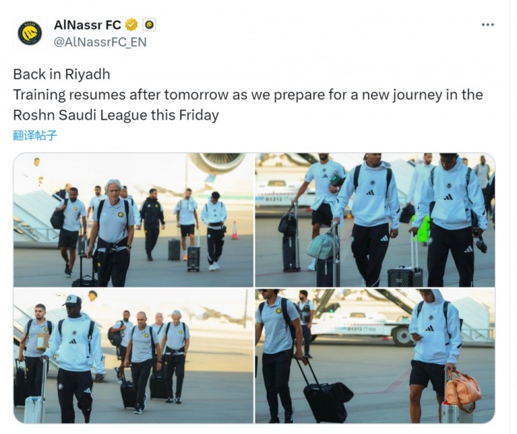利雅得胜利官方社媒晒出照片,确认主帅热苏斯携球员们回到利雅得,球队将在明天之后恢复训练,为下场联赛做准备。