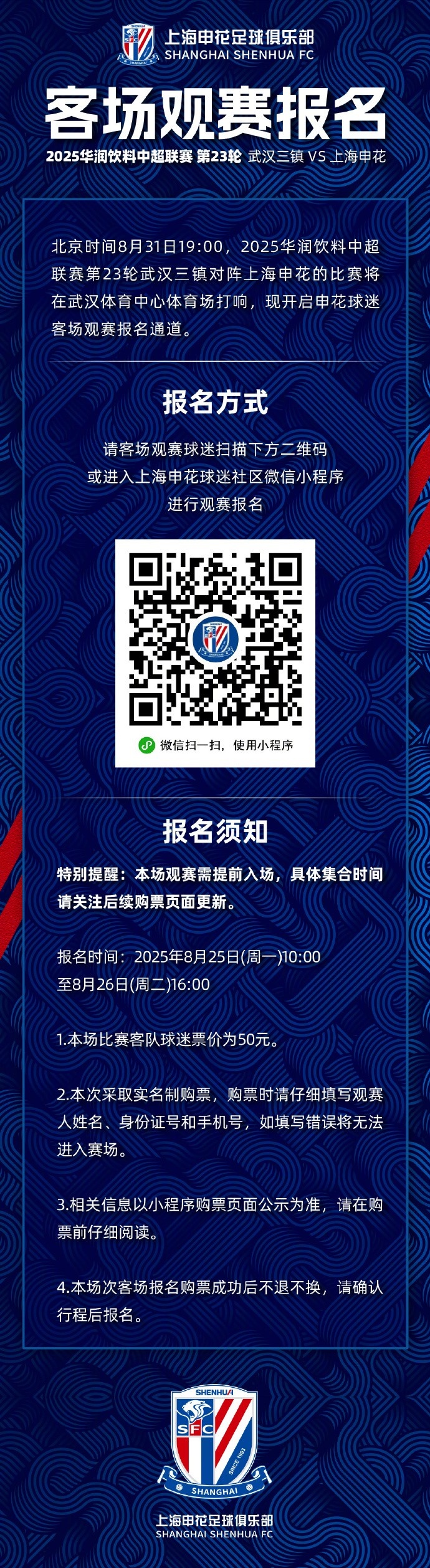 2025华润饮料中超联赛第23轮 武汉三镇 VS 上海申花 客场观赛报名