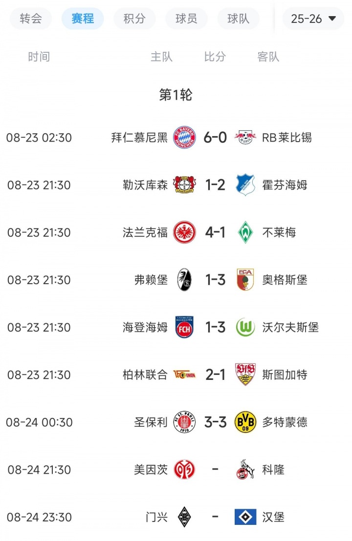 德甲首轮战罢多场,拜仁6-0大胜劲旅莱比锡,几乎锁定首轮榜首。反观其他强队,翻车一大堆。