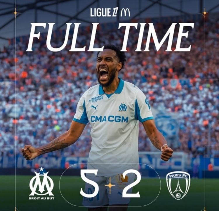 8月24日讯 法甲第二轮比赛,奥巴梅扬梅开二度,马赛主场5-2击败巴黎FC。