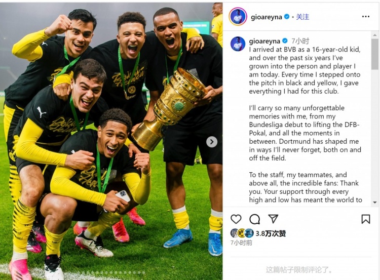 小雷纳社媒写道:“我16岁时加入多特蒙德,过去6年间我成长为如今的球员,每次身披黑黄战袍踏上球场,我都为这家俱乐部倾尽全力。