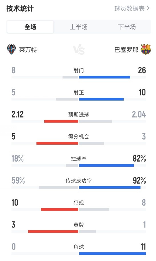 莱万特2-3巴萨全场数据:射门8-26,射正5-10,控球率18%-82%