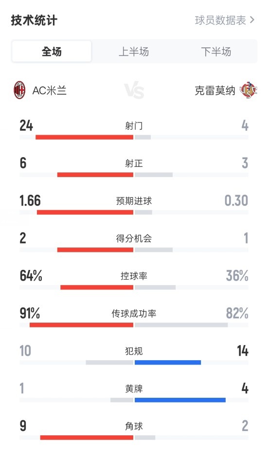 米兰1-2克雷莫纳全场数据:射门24-4,射正6-3,控球率64%-36%