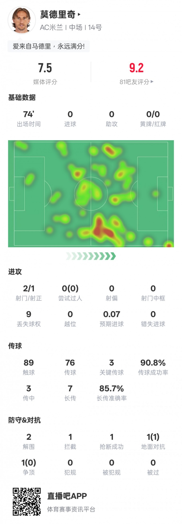 莫德里奇本场数据:3关键传球2解围&传球成功率90.8%,评分7.5