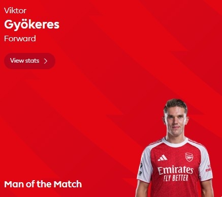 8月24日讯 2025-26赛季英超第2轮,阿森纳5-0利兹联,约克雷斯首发出战,赛后以52%的支持率当选全场最佳。