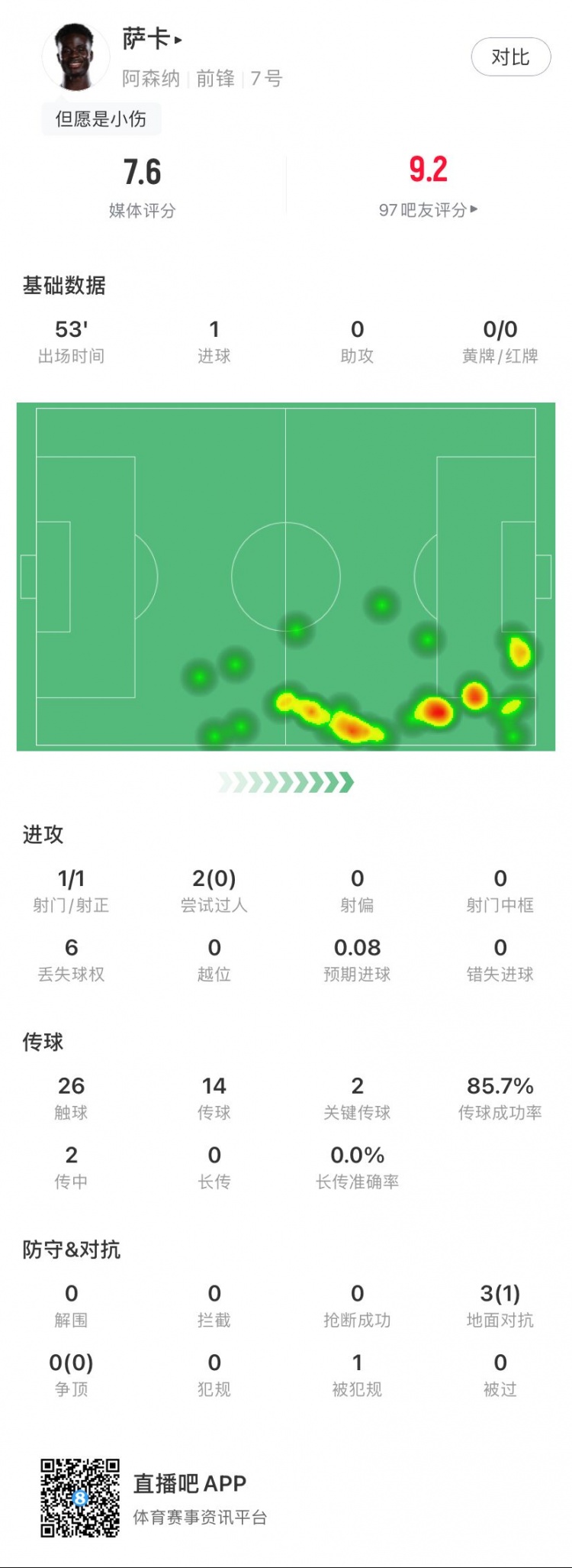 愿无大碍!萨卡本场数据:1个进球,26次触球,2次关键传球