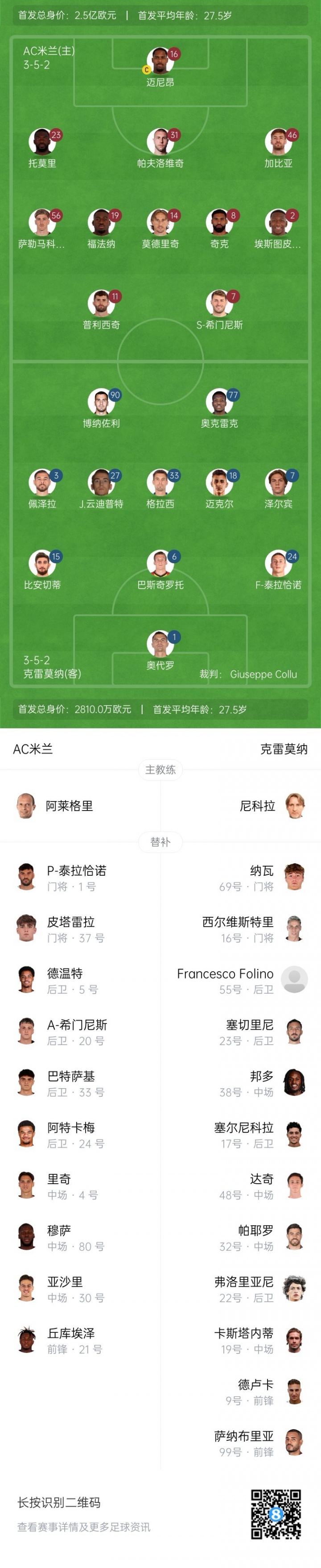 米兰首发:16-迈尼昂、23-托莫里、46-加比亚、31-帕夫洛维奇、2-埃斯图皮尼安、8-奇克、14-莫德里奇、19-福法纳、56-萨勒马科尔斯、7-S-希门尼斯、11-普利西奇
