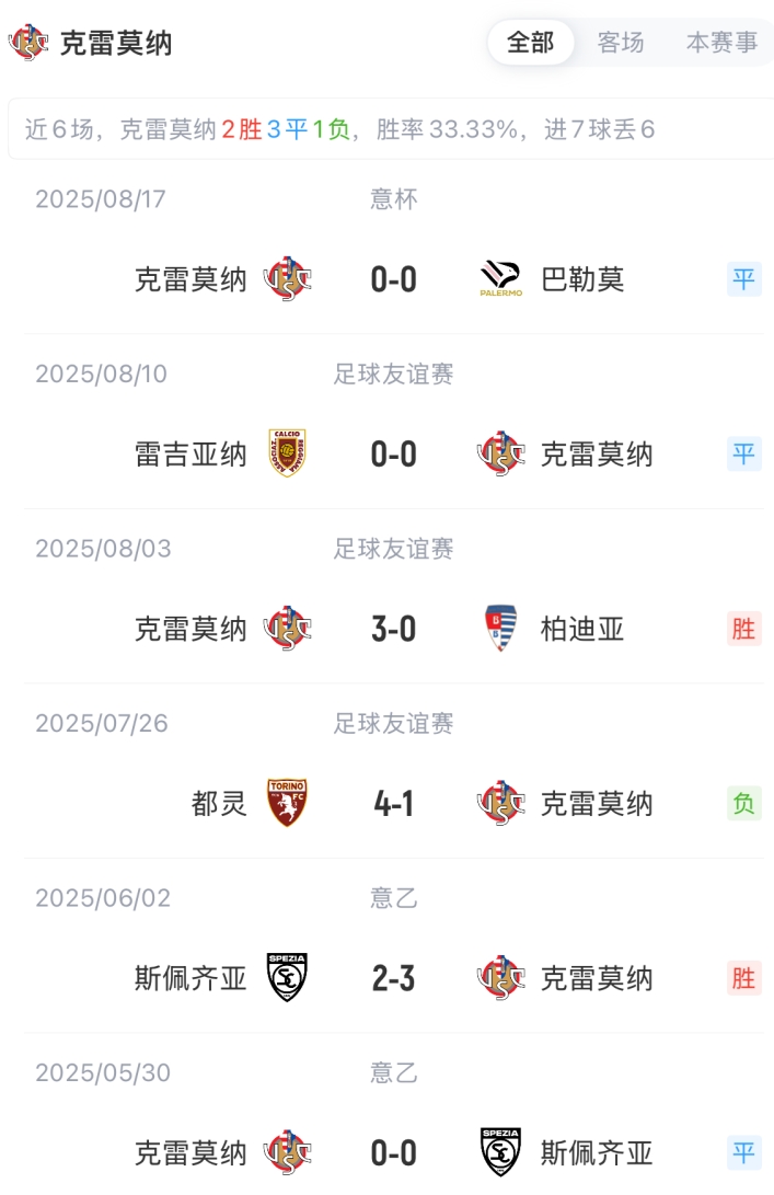克雷莫纳首发:1-奥德罗、15-比安切蒂、6-巴斯奇罗托、24-F-泰拉恰诺、3-佩泽拉、27-云迪普特、33-格拉西、18-科洛科洛、7-泽尔宾、90-博纳佐利、77-奥克雷克