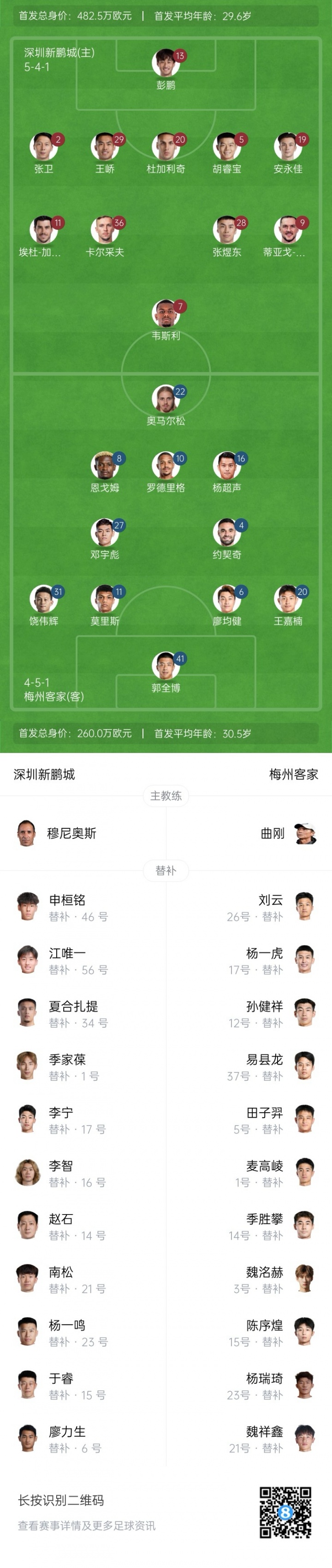 新鹏城vs梅州首发:安永佳、韦斯利先发,恩戈姆、奥马尔松出战