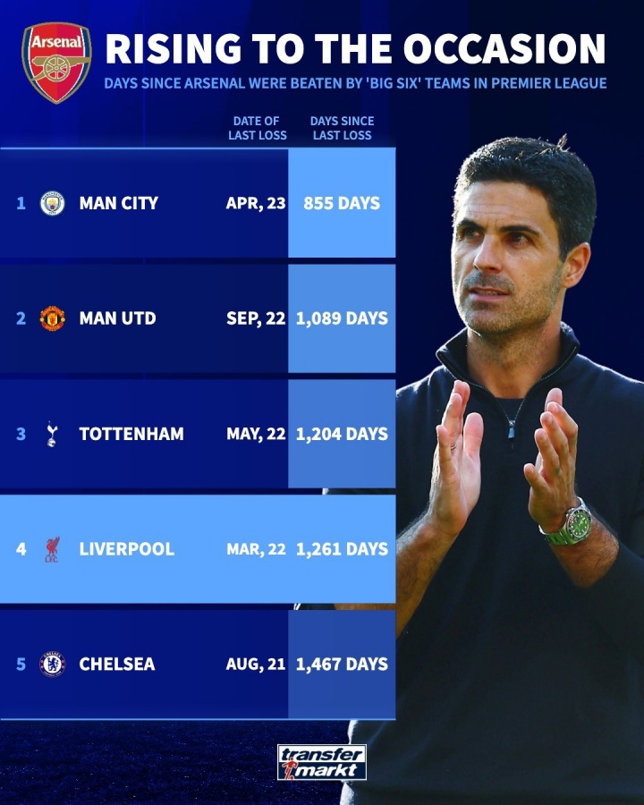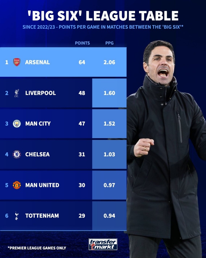 08月31日讯 据德转统计,阿森纳已有超过2年未在英超中输给其他5支“BIG6”球队,在“BIG6”球队身上相互取得的积分也位列第一。