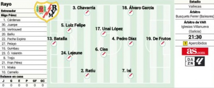 巴列卡诺首发预测: