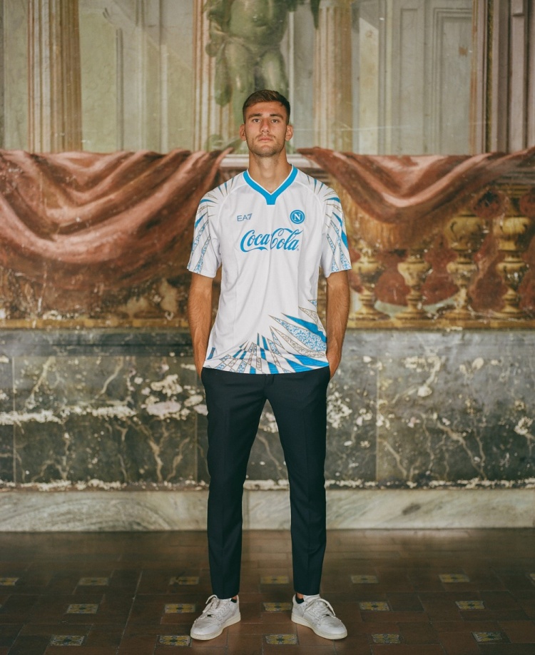 设计亮点是球衣上的地砖几何图案:这一设计理念特别致敬了坎帕尼亚地区的波旁王室居所:波蒂奇皇宫,设计结合了历史的优雅和运动的现代感,形成了时尚与足球的独特结合。并以金色点缀,唤起了皇家居所的装饰风格。流畅且现代的设计线条重新诠释了壁画和马赛克的华丽。