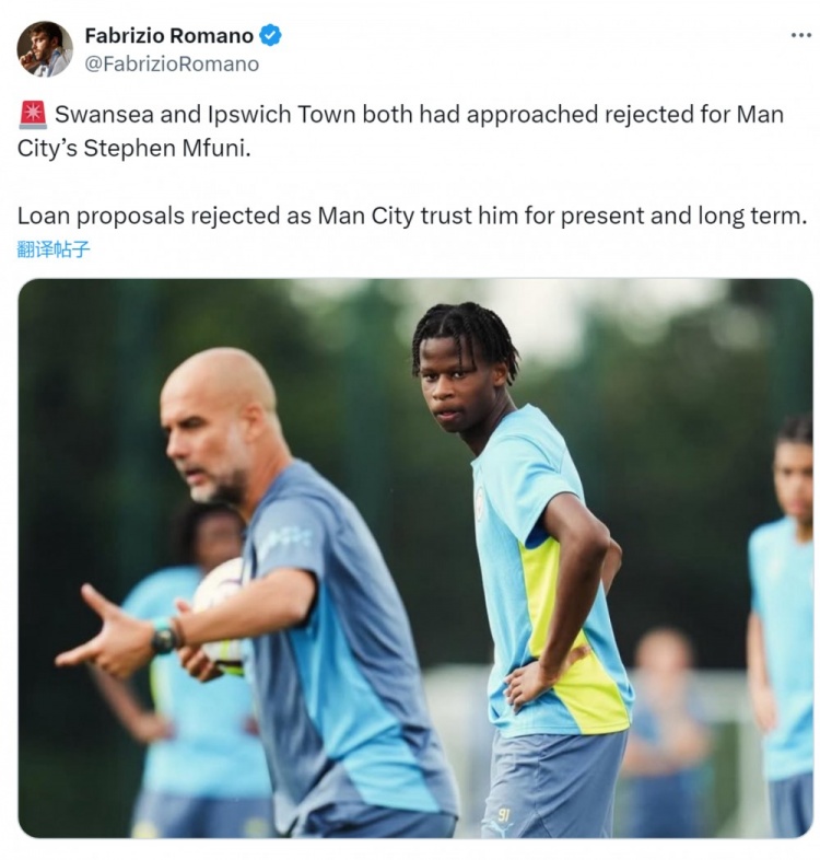 罗马诺:斯旺西、伊镇有意17岁中卫姆富尼,但租借提议被曼城拒绝