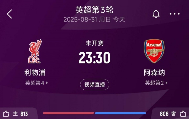 热刺输球后,英超还剩下利物浦和阿森纳两支全胜的球队。而在今晚23:30,两队将迎来正面交锋。