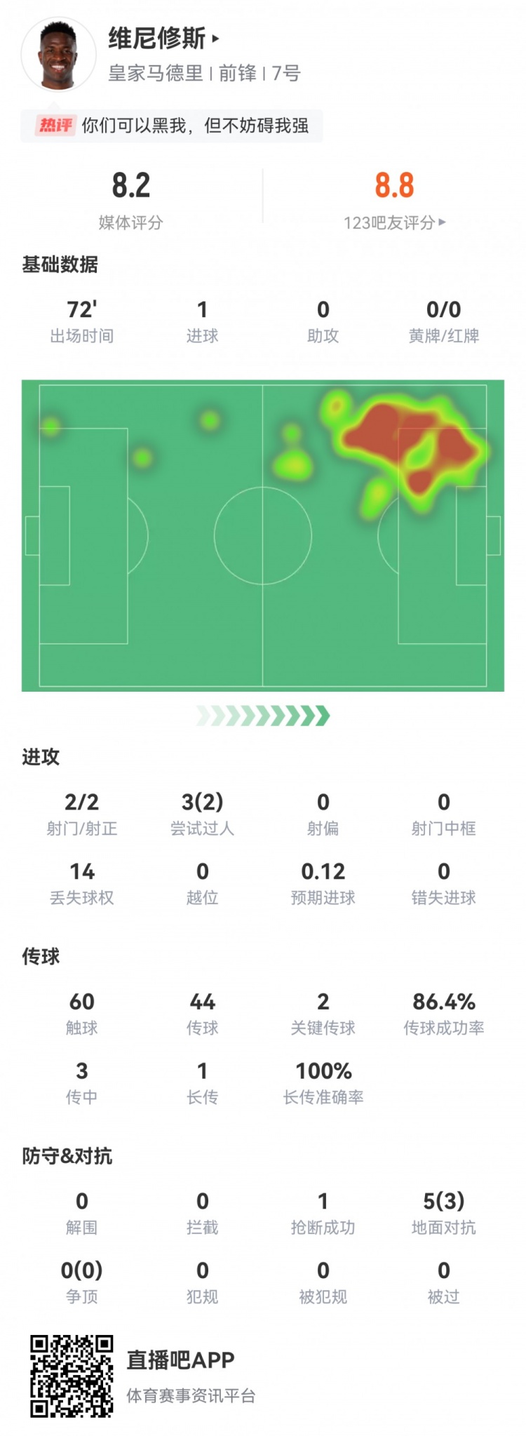 一条龙破门!维尼修斯数据:2射2正1进球,2过人2关键传球评分8.2