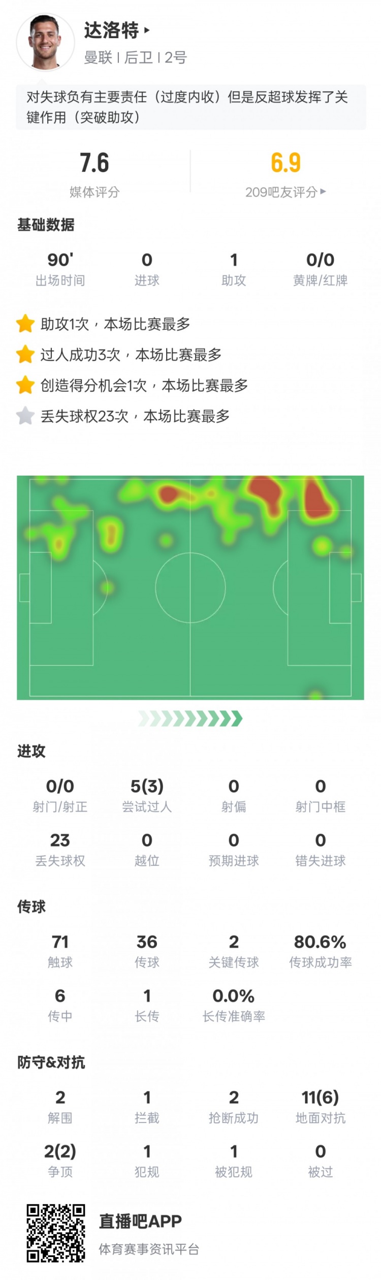8月31日讯 2025-26赛季英超第3轮,曼联3-2险胜伯恩利。达洛特本场首发出战,贡献1次助攻,送出2次关键传球,还有3次过人成功以及2解围2抢断,但也有全场最多的23次丢失球权,评分7.6。